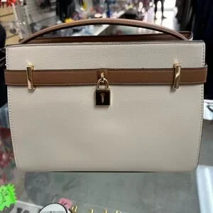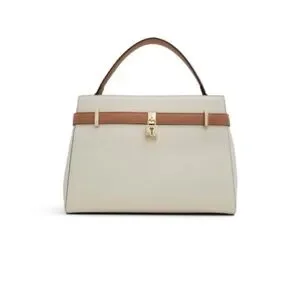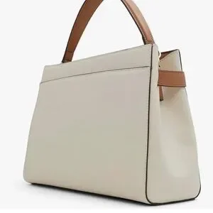Drawing inspiration from vintage luggage, this two-tone leather satchel is smartly designed with a spacious interior and protective metal feet.