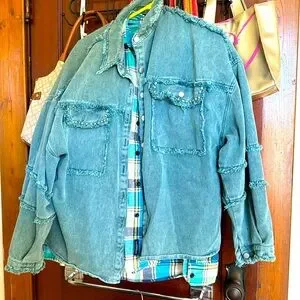 POL oversized jean jacket with silver detail. Bottom detail. Never worn. It’s a light teal color. It’s in between a light and dark hard to describe. Tried to capture true color. Best in 3 an 4 pics.