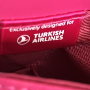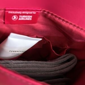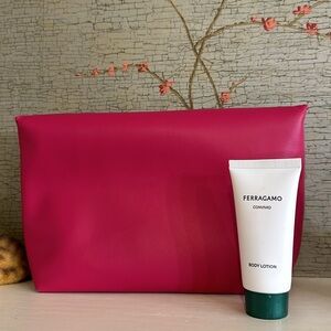 Pink Ferragamo Parfums Make up bag is a Turkish Airlines Business Class flight gift. Snap closure. A pair of gray socks & eye mask are included. A 1 fl.oz. Body lotion is included. New products. Bag:8 1/2” x 5 1/2”.