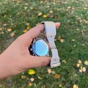 51mm case, 26mm band width, mineral crystal, Quartz movement with chronograph analog display, imported..,Round stainless steel case, with a silver dial..,Silver, stainless steel bracelet.,Water resistant up to 100m: Can be worn bathing, swimming or snorkeling and shallow diving