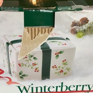 🌿NWOT Pfaltzgraff Winterberry Santa Treat Jar. Very cute Santa on top of jar. Never used, in perfect condition with No chips, cracks or stains. Off White with green ribbon and green holly & red berries. A little tear on box. Original packaging. I will pack with care to ensure your treasure will arrive to you safely.🌿