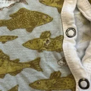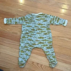 Adorable fish pattern Milkbarn pjs in 3/6 months. One small home near buttons, not noticeable when wearing because of the pattern.