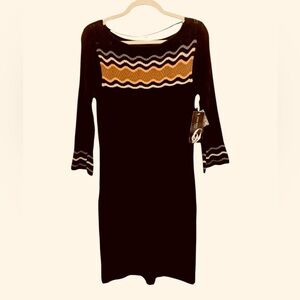 Nine West NWT Black Sweater Dress With Chevron Design in Front in white yellow and bluish gray Sz Sm