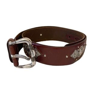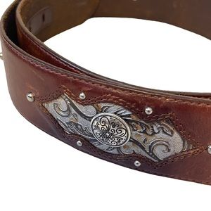 Accessorize any look with this brown leather belt from Brighton that is embellished with engraved silver metal accents.