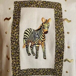 Vintage 90's Zebra sweatshirt in cream color. The original tag has been removed but I found the same sweatshirt online with the tag still attached, so I believe it is P.G.B. brand (pictured). Vibrant neon embroidered zebra framed in a cheetah/glitter spots design surrounded by gold stud and squiggle bedazzles. Minor pilling, very light stains on the underneath of the left arm, as pictured. measures 18-19” pit to pit