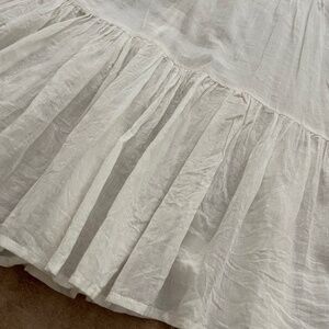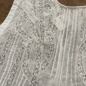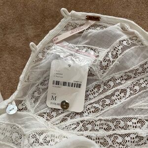 This romantic Free People Imaginary Friend tunic features beautiful lace inserts, pin tucks, shell button and loop back closure, and a deep flowy bottom ruffle. This sheer cotton fabric tunic with intentionally deep open sides is to be worn with a strappy or crocheted bralette or sexy bandeau; pair it with jeans and live freely. Also, makes a cute bathing suit cover up.