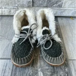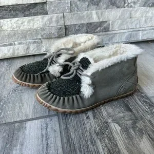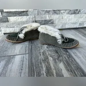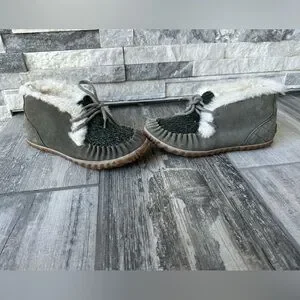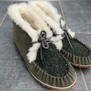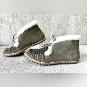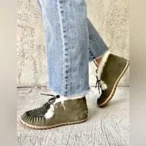 Sorel Out N About Moc Olive Green Suede & Fabric Shearling Lined Moccasin Sz 7