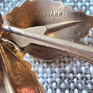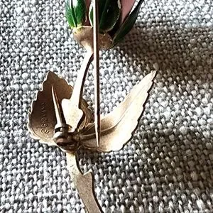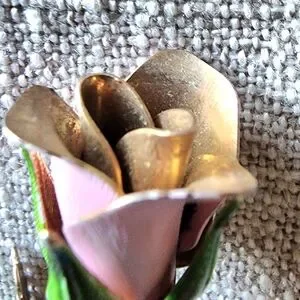 Vintage Giovanni Pink & Green Enamel Rose Stem Leaf Brooch. Gold tone.
