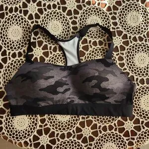 This racerback sports bra is a super cute gray and black camouflage print. The cups are lined in a hot pink color. This is labeled as the ultimate push up bra and is an XL. PLEASE NOTE......IT FITS MORE LIKE A LARGE.
