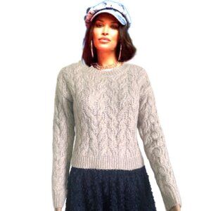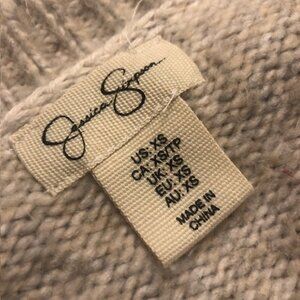 JESSICA SIMPSON very soft, cozy, beige-lilac hued cable knit sweater, long sleeves, crew neck. Very good condition, worn a couple of times. Polyester/Acrylic/ Nylon Hand wash cold water. Length 20 Inch Size XS