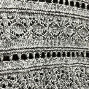 Beautiful short-sleeve cropped cardigan featuring intricate crochet knit detailing and button-front closure. Made from 100% cotton with delicate eyelet pattern bands. Perfect for layering over dresses or pairing with high-waisted bottoms. Ideal for office, casual outings, or evening events. Feminine and versatile piece that adds elegant texture to any outfit.