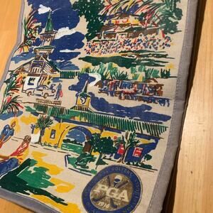 This vintage canvas tote bag features a vibrant, colorful design showcasing a PGA golf course scene, adding a touch of nostalgia and charm. The bag has sturdy wooden handles, giving it a rustic appeal, and its spacious interior makes it a practical accessory for everyday use. The fabric feels durable, while the print, capturing various golf-related elements, gives it a unique collectible value for golf enthusiasts or anyone looking for a stylish tote with personality. Ideal for casual outings or as a gift.