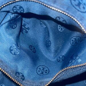Tory Burch, blue leather, gold hardware, top zip closure. D rings behind handles for crossbody strap (missing). Clean interior. EUC.
