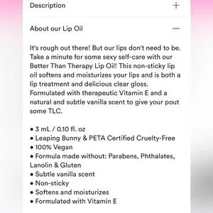 • DESCRIPTION: A clear nourishing lip oil that adds glossy shine with a subtle sparkle. Looooove this stuff! You will instantly begin reaching for it all day long. Makes lips super soft, and I love the shine!