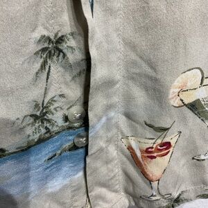 Men’s Tropical Vacation Beach Button Down Shirt Size L. Fishing Marlin Palm Tree, Cocktails in like new condition