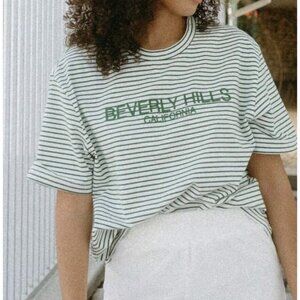 Ellandemm Beverly Hills White Green Striped Short Sleeve Tee Top Embroidered NWT