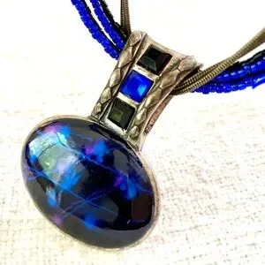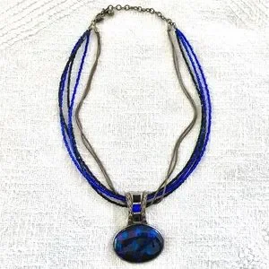 Chico’s brand necklace is deep cool tones of vibrant blue & some purple hue in black with silver metal setting & closure & beaded multi strand. Length is approximately 9” adjustable length necklace plus about 2” (see photos for measurements); a statement piece to add a professional & artistic style to dress up a cardigan & shell or tee, or a dress or button down or v-neck…many options for this pretty piece! It could benefit from a silver cloth polish or wear as is with more character.