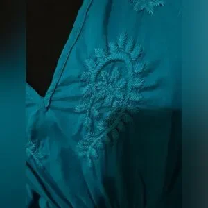 This swimsuit coverup is almost new, worn only a couple times and always hand washed. Pom Poms are in great condition. Beautiful teal blue green color. This is a ladies size medium with an elastic waist.