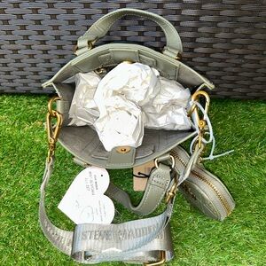 Upgrade your style with the chic Steve Madden Mini-Blivonia 2-Piece Satchel Set in a stunning olive green. This versatile set includes a compact, stylish mini satchel paired with a heart-shaped zipper pouch for added flair. Perfect for carrying your essentials with style, this set is ideal for everyday use or as an eye-catching accessory for special outings.