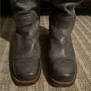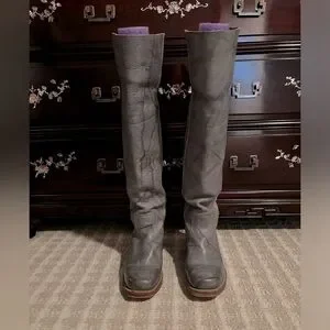 Very hard to find marbled grey Frye tall Campus boot. Only worn a few times, barely broken in. This is a legacy boot that will never go out of style & goes with everything! Dresses, skirts, jeans, tights- they are all class & funky style. They’ve never been worn in wet conditions, no wear on heels, almost new condition. Beautiful light/dark grey marbled leather with a top that can be folded down for below the knee or up for kneecap height (I am 5’9”). I punched the holes & added laces because otherwise they flap open & look like pirate boots. I have a hundred colors of leather and I can change out laces or add extras. Absolutely love these boots but I have too many Frye…. Heartbreaking.