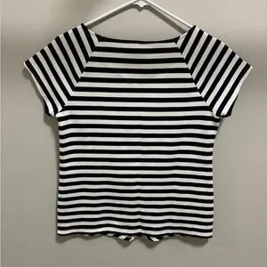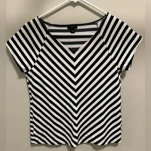 Never worn! Ivory and black, short-sleeve, v-neck top, 78% rayon, 20% polyester. Smoke-free home. Reasonable offers welcomed!