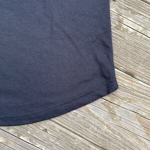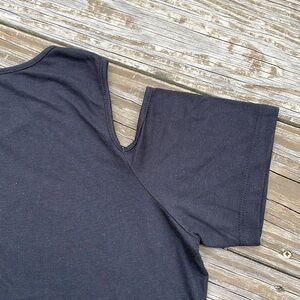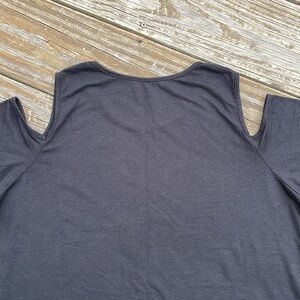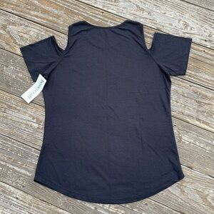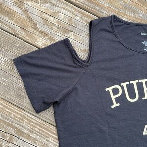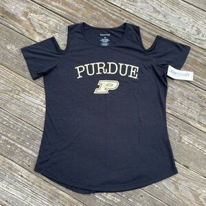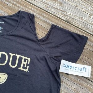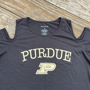 Calling all Boilermaker fans! Cold shoulder Purdue University tee in black, the pics show a lighter shade the closer I zoomed in, but this piece is a solid black with a tan logo along the front and a plain back. Is a fitted style with a crew neck, is brand new with tags, never been worn, and lying flat measures approximately 19 inches armpit to armpit and 24 inches shoulder to hem. Machine washable/tumble dry.