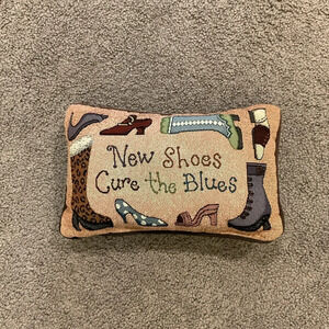 Vintage ‘New Shoes Cure The Blues’ Decorative Bed Chair Pillow, excellent condition, heels, pumps, boots design, pricey pillow, tag was cut off, measures 12 x 7”., great gift for the avid shoe lover! Cottage, shabby chic, rustic. Ballet core, Cottage Core. Will ship right away. Check out my other designer items