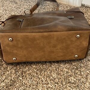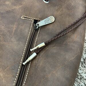 Justin boots brand cute shoulder bag with double straps, braided, bolo details, double zip concealed carry pocket on the back, fully lined with logo fabric. Inside has two slip pockets and one zippered pocket. Bag measures 15 1/2 x 12 x 5 1/2“. Strap drop is 10 1/2 inches. Metal control and lace cut out detail on front with metal studs and crystals. Four metal feet on bottom. Carried once. No flaws, stains or damage. Smoke-free home.