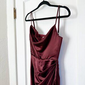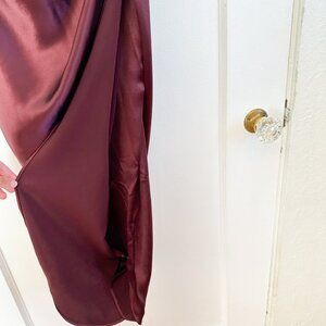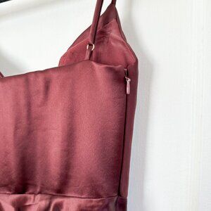 This work of art is set to outshine all your favorite HOCB dresses. Crafted from our signature heavyweight stretch satin in Raisin, it features a fully boned and fused under corset that cinches the torso and waist for a perfect silhouette. The balconette-shaped bodice is boned front, back, and sides for comfortable cinching and lined in stretch crepe for a non-slip effect. The adjustable straps and supportive internal corset mean no bra is needed, with special 'side boob boning' for extra uplift and cleavage. The top layer's draped neckline adds a romantic touch. The fully lined skirt has stitched gathers at the hips and a front slit for a flash of thigh. Suitable for all bust sizes, the balconette cut ensures a flattering fit. Date nights, romantic dinners, prom, homecoming, formal, Girl's nights out, Zoom parties where glam is needed.