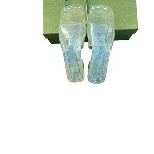 Gucci platform clear size in women’s size 8. These like new slides come with all original box, 2 dusters & tag. Embossed Gucci logo on front. Rubber sole with heel height of 2.4”. These have been worn a couple of times. So versatile & goes w/jeans to dresses. ?’s welcomed.