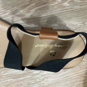 Like new sylish black sandals, with a touch of camel on one strap stretchy material sure is a comfortable fit. Barely worn.