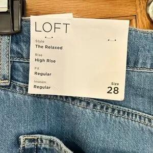 Loft jeans, size 28/6. They are relaxed fit so they run on the bigger side. They are high-rise and have a regular inseam. Also they have detailing at the bottom.