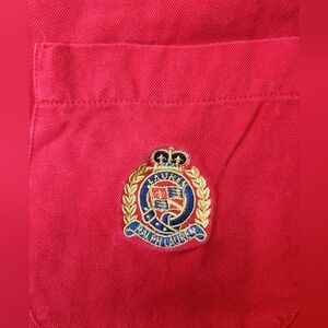Lauren Ralph Lauren Red button down long sleeve shirt with sleeve roll up buttons. Left breast pocket with embroidered emblem. 100% silk. Good condition, size Medium
