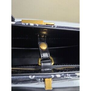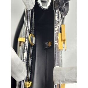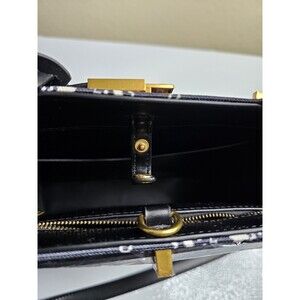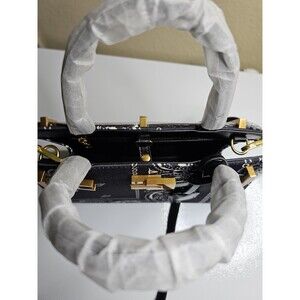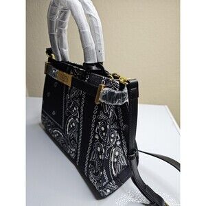Introducing the NDG Jeanne 300MM Black Bandana Top Handle Bag, a stylish and functional accessory for women. This medium-sized pocketbook features a beautiful paisley pattern with gold hardware accents. The bag has a detachable strap and comes with an original dust bag, making it easy to store and transport. The NDG Jeanne bag has bottom studs and inner pockets for added convenience. The handle and strap are made of vegan leather, while the hardware is gold in color. This top handle bag is perfect for any occasion and complements any outfit. Get your hands on this stunning NDG bag today!