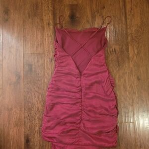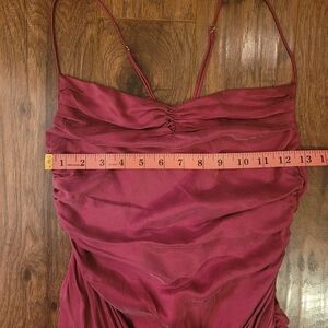 excellent condition, fully lined velvety material, ruched design is super flattering and sexy, more of a burgundy color
