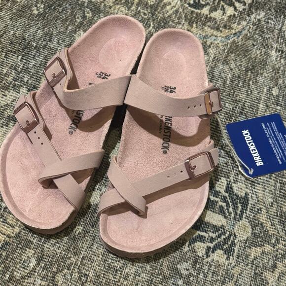 The Mayari for kids from BIRKENSTOCK - a comfortable sandal with adjustable, crisscrossing straps that form a single loop around the toe. Classic support and adjustability, designed beautifully. The upper is made from the skin-friendly, hard-wearing synthetic material Birkibuc®.