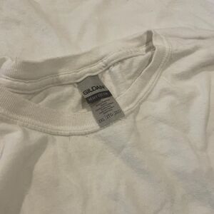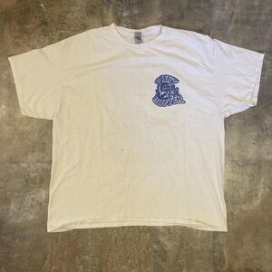 gildan white and blue graffiti logo graphic paint shop tshirt size 2xl. tiny hole pictured. see measurements. :)
