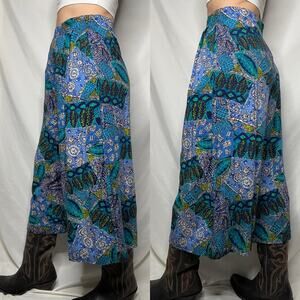 Vintage batik geometric patchwork print wide leg crop culotte palazzo pants blue cropped high rise waist. Partial elastic waist with some give. 100% rayon. Gently used vintage condition. Check out the video of this gem in its current condition!
