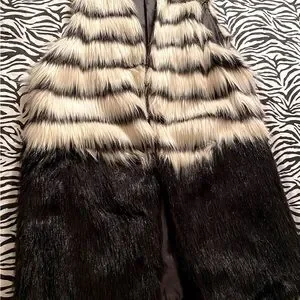Stylish faux fur vest with bold black and white stripes. Perfect for adding a statement to any outfit. Soft and luxurious feel.