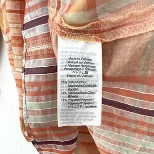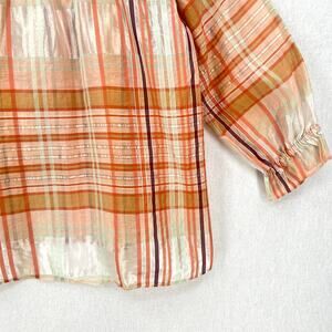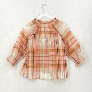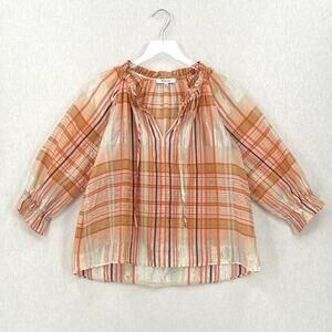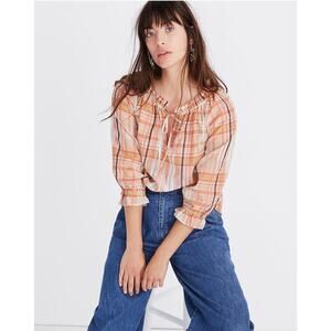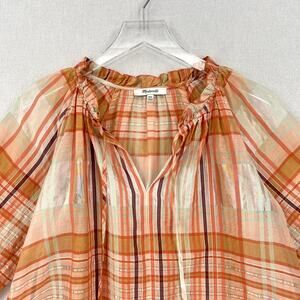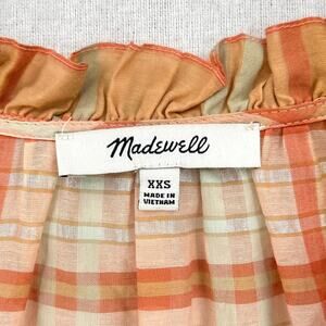 MADEWELL Plaid Tie Neck Ruffle Top Womens XXS Cream Orange 3/4 Sleeve Blouse