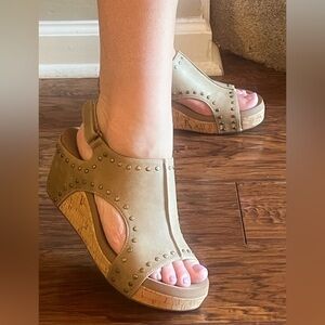 New! corkys footwear carley wedge sandal in taupe oil pu with studs