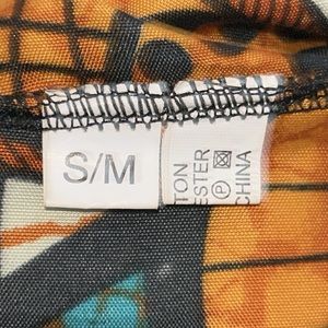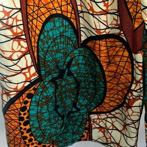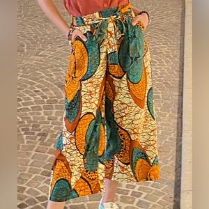 These pants feature a bold batik print with elasticized waist, attached front tie belt, and 2 side slant pockets. Tag size small/medium