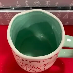 The cutest new Rae Dunn holiday mug perfect for cat lovers! Adorable ribbon stitching, scallops and red and mint design.