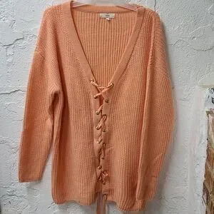 Beautiful soft crochet like sweater featuring a complete tie front, string can be removed or pulled out for a completely different look. Size large, the color is peach, orange pinkish color, from entro. No damages, gently used.