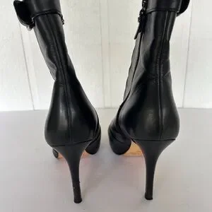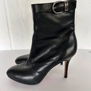 Via SPIGA black leather boots. Size 8.5. Smooth soft leather. Rounded almond toe. Short boots. Side zippers 100% leather lined. Wear to soles, heel tips in excellent condition, mostly worn indoors at work. SILVERTONE buckles at top.