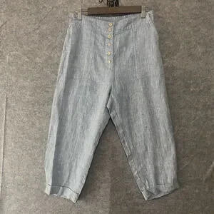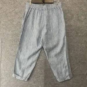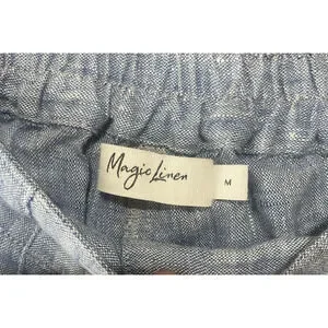Magic Linen Crop Pants Womens Sz M Blue 100% Linen Pockets Button Close Elastic