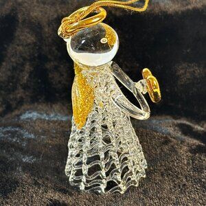 This exquisite glass angel ornament features intricate craftsmanship, highlighted by shimmering gold wings and a delicate gold heart. The angel's transparent design adds elegance to any space. A perfect addition to holiday decor or as a thoughtful gift.