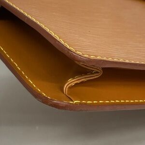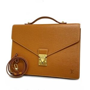 This is an authentic LOUIS VUITTON Monogram Porte Documents Bandouliere. This stylish briefcase is crafted of Louis Vuitton brown epi canvas. The case features a sturdy reinforced top handle and a frontal v-shaped flap and polished brass press lock closure. The flap opens to a partitioned green leather interior. This is a marvelous briefcase, ideal for professional or personal use, from Louis Vuitton! No accessories. slide pocket interior starting to peel. Date code MI0920. 28cm by 38cm.