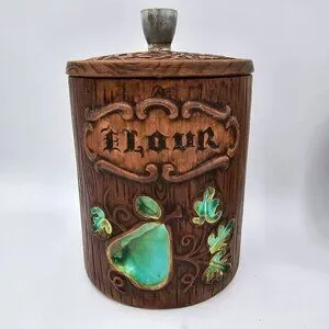 Vintage Treasure Craft canister set for organized kitchen storage. Includes Flour, Coffee, and Tea canisters with rustic wood look and green accents.