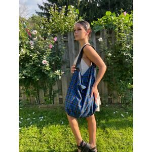 Handmade, blue plaid large hobo bag, vintage cotton fabric, leather strap